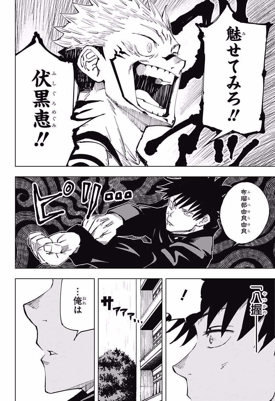 少年院へと足を踏み入れた虎杖悠仁、伏黒恵、釘崎野薔薇の三人は、予想をはるかに超える力を持つ特級呪霊と対峙することになる。圧倒的な呪力の前で野薔薇は戦線から引き離され、伏黒と悠仁は連携を取りながらも、次第に追い詰められていく。